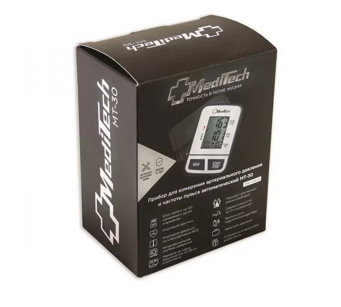 - Тонометр МТ-30 автоматический со стандартной манжетой 22-36 сантиметров имеет технологию интеллектуального измерения IQ SYSTEM, благодаря которой прибор сам определяет уровень накачки манжеты.