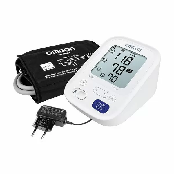 - В комплекте с измерителем артериального давления Omron M3 Expert поставляются универсальная веерообразная Omron Easy Cuff, модель HEM-RML31, для пользователей с длиной окружности плеча от 22 до 42 см. и сетевой мини-адаптер Omron HHP-CM01 для питания от бытовой электросети. Прибор также может питаться и от набора батареек, которого, благодаря технологии энергосбережения, хватит примерно на 1000 процедур измерения давления.