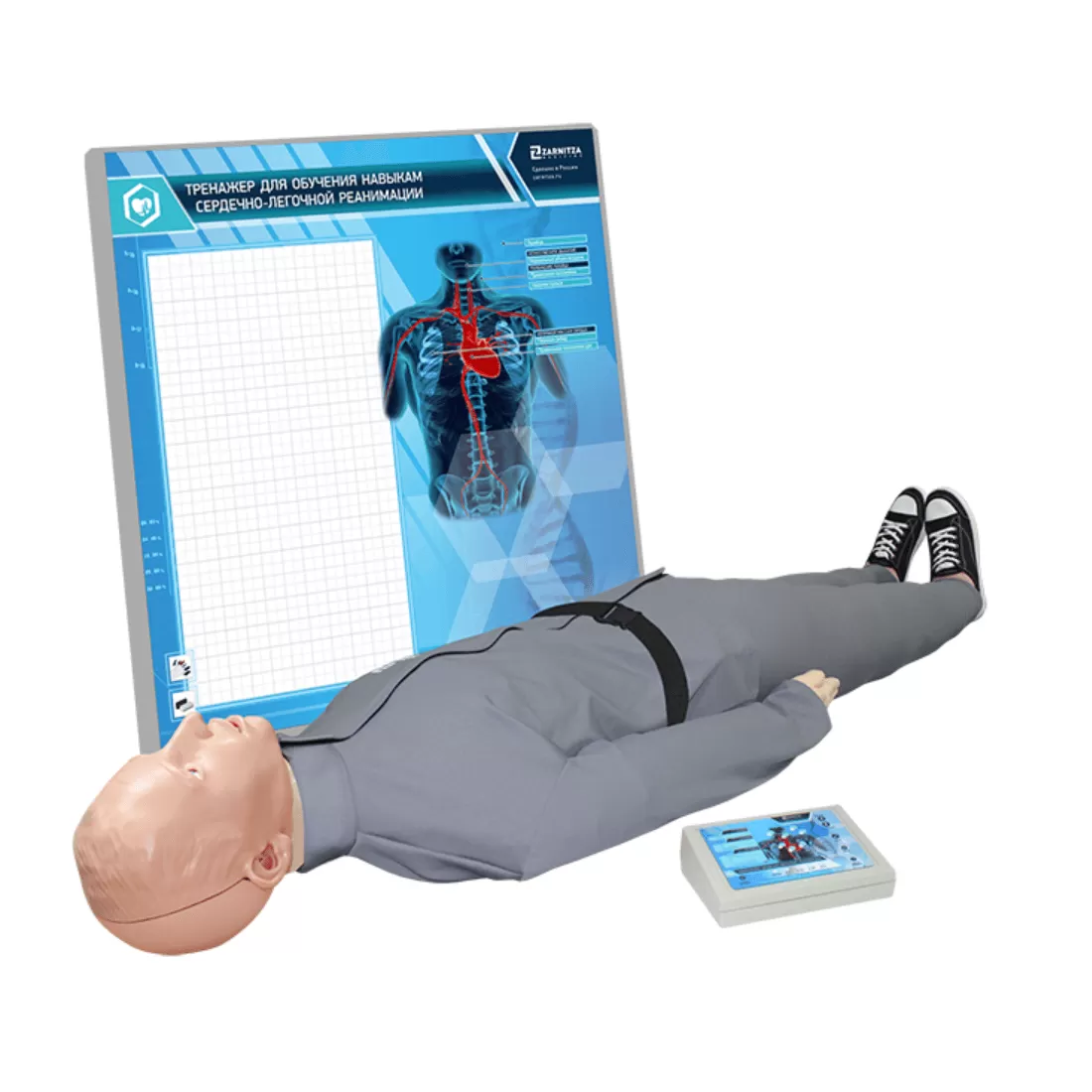 Тренажер-манекен представляет собой имитацию полноростового взрослого пострадавшего и предназначен для отработки приемов сердечно-легочной реанимации с возможностью контроля качества выполнения упражнений.