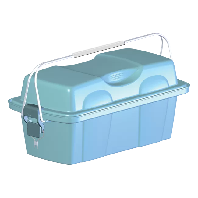 | Конструкция | Укладка представляет собой корпус с парой симметрично расположенных ручек и крышкой. Для фиксации крышки на корпусе предусмотрены замки. При необходимости на замки можно установить пломбу. Для удобства при транспортировке на ручки укладки устанавливается накладка-ручкодержатель.  |