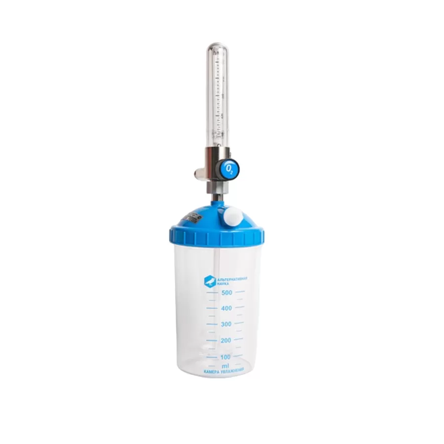 Увлажнитель кислорода медицинский предназначен для открытых дыхательных систем (кислородная палатка, носовые канюли, маска).Составными частями увлажнителя кислорода являются: емкость с крышкой и расходомер с флуометром. При прохождении кислорода через емкость с дистиллированной водой, относительная влажность кислорода на выходе составляет не менее 85%. Расходомер с флуометром позволяет измерить скорость потока газа и плавно регулировать подачу газа(кислорода) пациенту.
