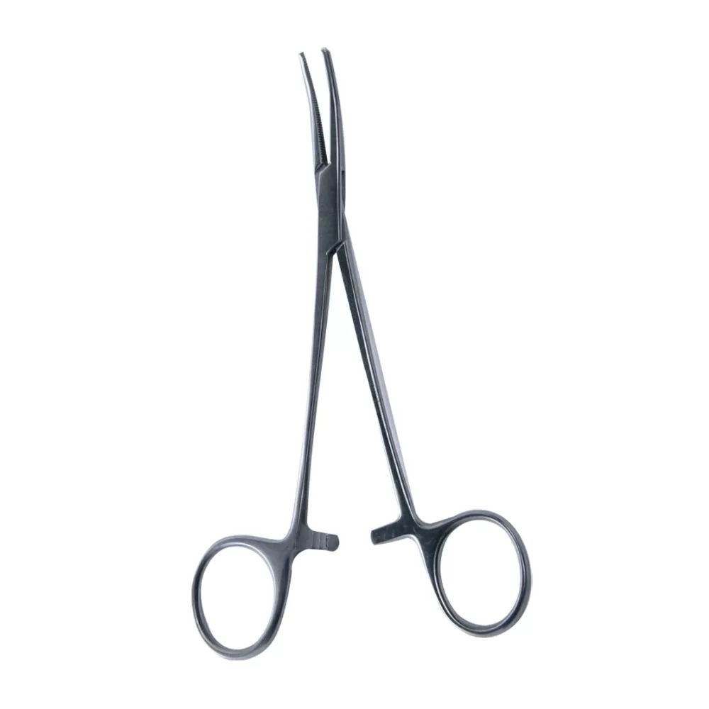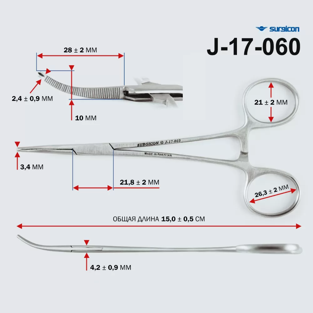 Зажим кровоостанавливающий 1x2 зубый, зубчатый изогнутый имеет узкие и длинные рабочие бранши. Бранши заканчиваются острыми зубцами. Зубец одной бранши входит между двумя зубцами второй бранши. Это травмирует ткань, но при этом надежно ее удерживает. Зажим имеет зубчатую кремальеру - фиксатор.- Общая длина - 150 мм