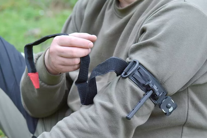 Способ наложения: Свободный конец ленты жгута кровеостанавливающего продевают в пряжку и образуют петлю для наложения ее на конечность, петля предварительно затягивается на конечности и фиксируется с помощью застежки «велькро» (к телу пациента должна прилегать гладкая поверхность ленты). Затем с помощью рычага затяжного механизма производится наматывание строп на оси катушки и дозатяжка жгута до полной остановки кровотечения.